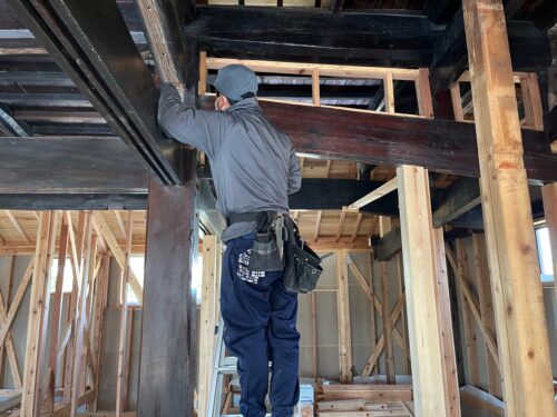この古い梁、梁の太さが一定ではないので、下地を作るのにも時間を要します。