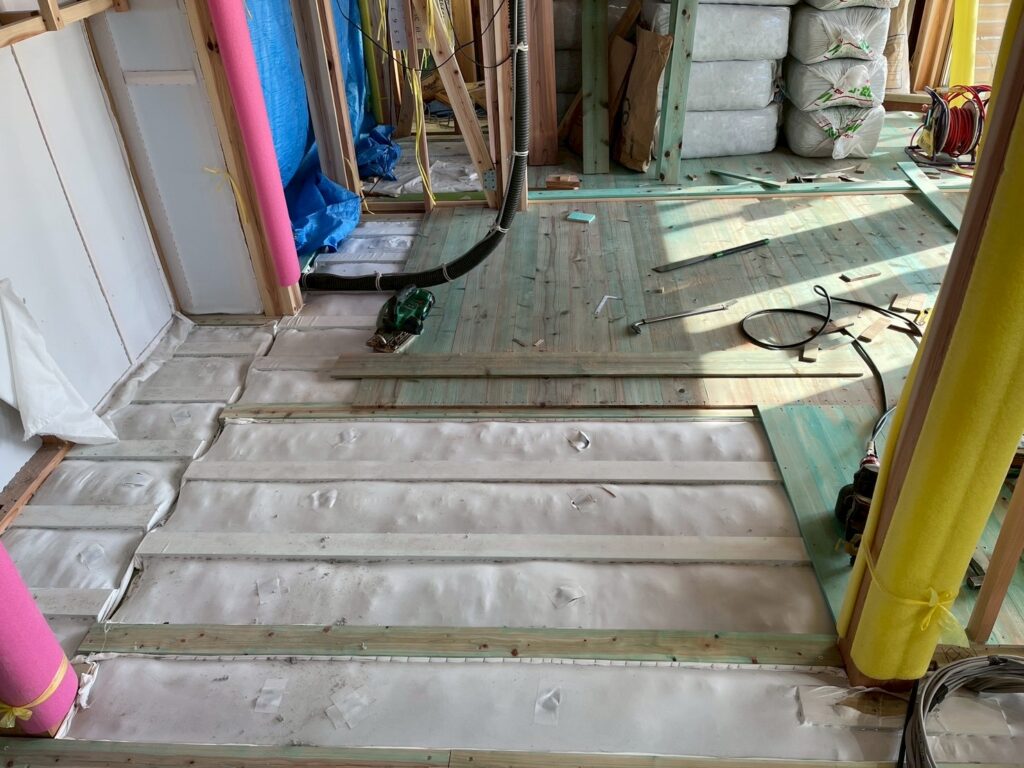 こんにちは。雨が降らない毎日が続いています。藤枝市では乾燥注意報も発令され、山奥では林野火災も発生。火の取り扱いには十分に気を付けましょう。断熱材の貼り終わった、焼津市K様邸。壁と天井貼りが始まりました。大工さん数名の作